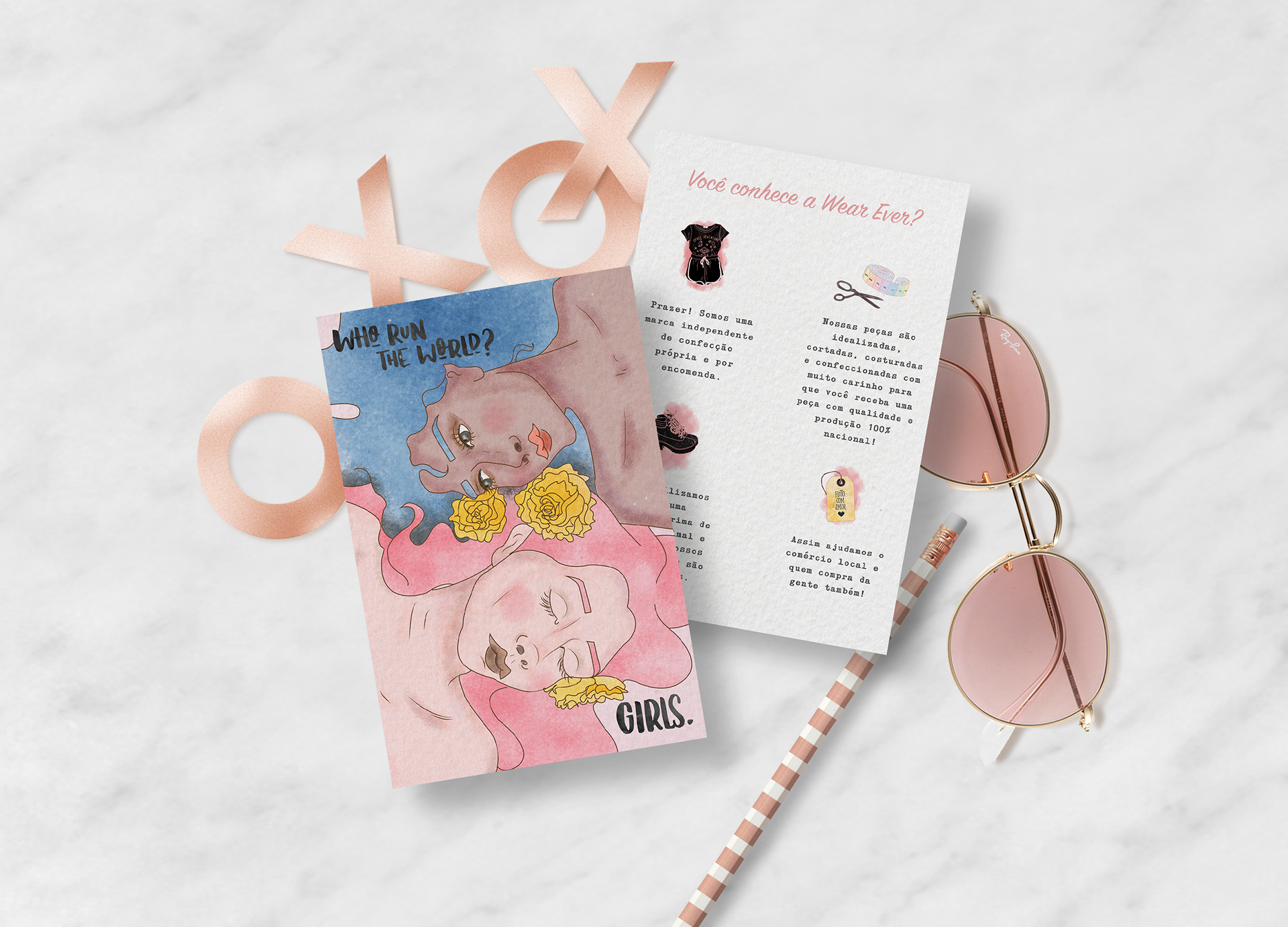 Para apresentar a marca às clientes, a Wear Ever me pediu uma série de ilustrações Girl Power, que dialogam com o conceito da loja e comporiam postais enviados durante as compras. São 5 ilustrações grandes, mais dez ícones preparados para compor o verso do cartão.